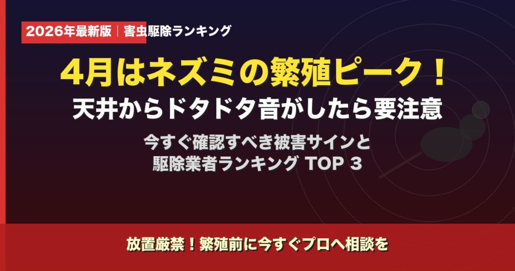 「天井でドタドタ…」4月はネズミの繁殖ピーク!今すぐ確認すべき被害サインと駆除業者ランキングTOP3【2026年最新】